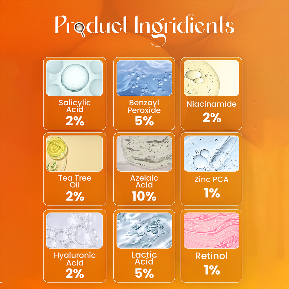 o Azelaic Acid and Lactic Acid gently resurface skin, reducing acne scars, dark spots, and uneven patches. Promotes a smooth, even-toned, and radiant complexion over time. Helps fade post-acne marks and pigmentation for visibly clearer skin.